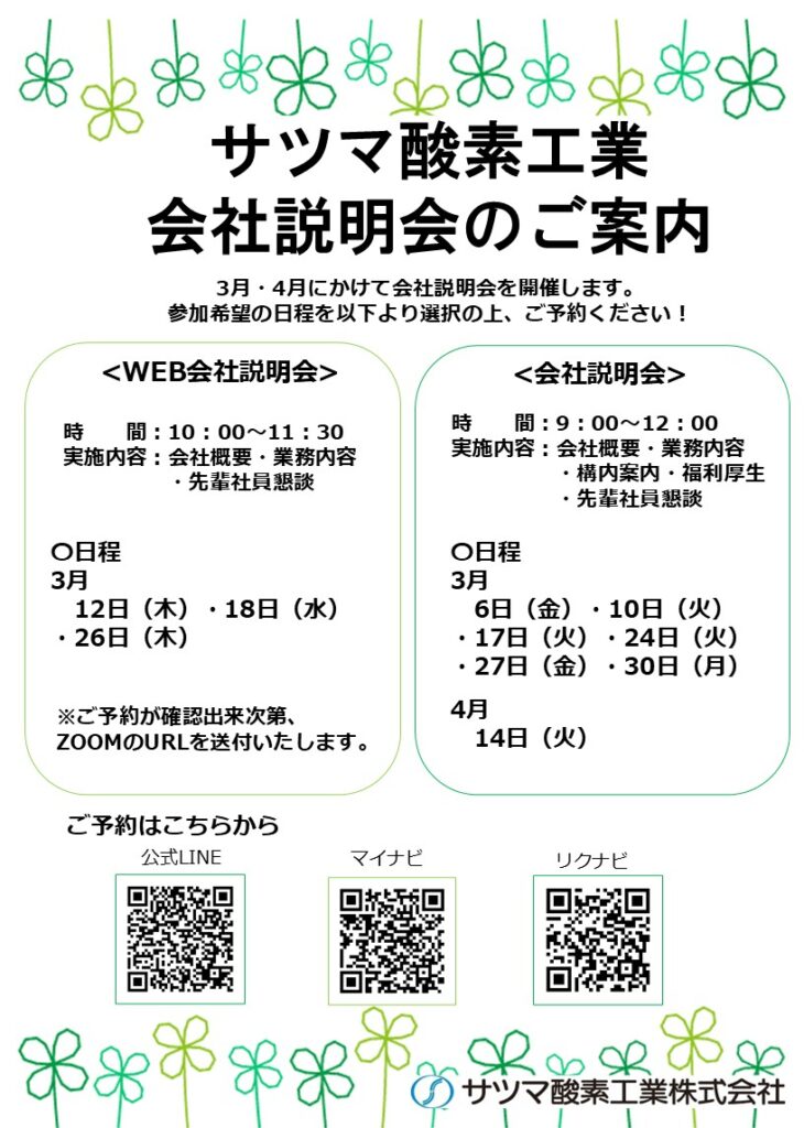 インフォメーション インフォメーション 2027年卒対象「会社説明会(3月・4月)」を開催します 3月~4月にかけて、個別会社説明会を開催します! 下記チラシに記載のQRコードを読み取りのうえ、ご予約下さい! 皆様とお会いできるのを楽しみにしております☻ 2026年2月2日